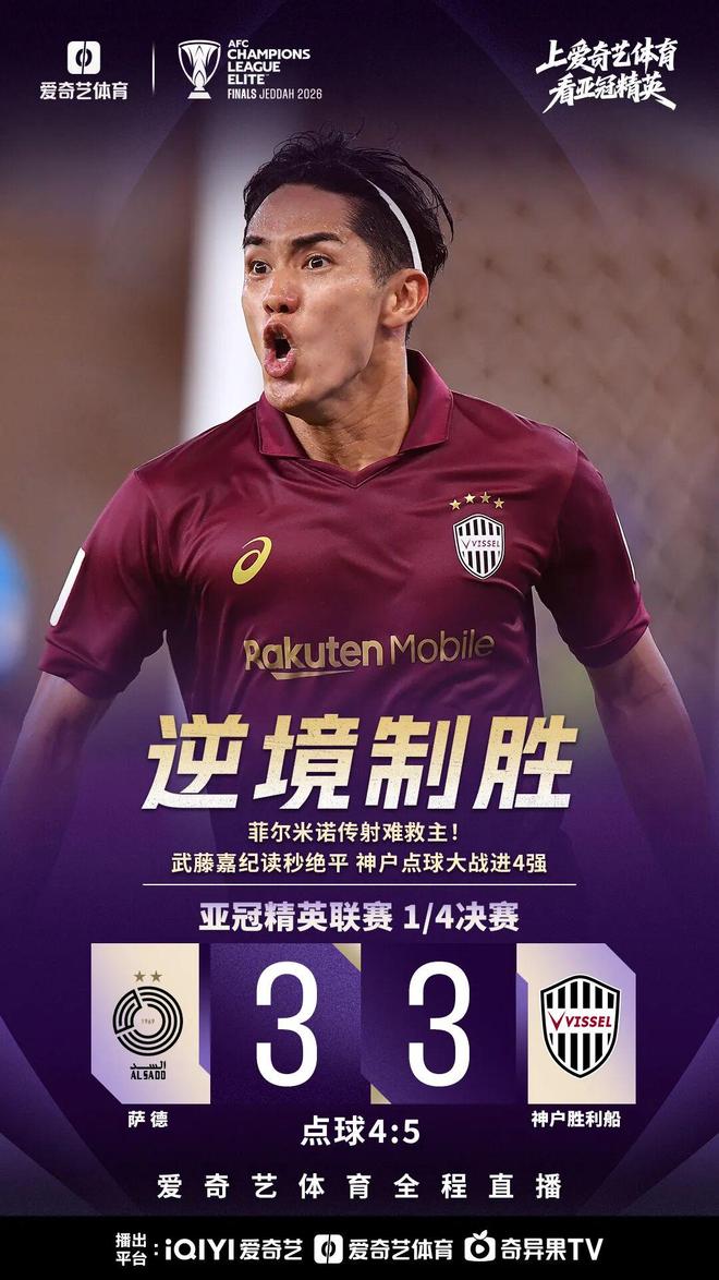 神户胜利船与萨德的对决中,前巴西国脚菲尔米诺传射难救主,武藤嘉纪读秒绝平。两队战至点球大战,最终日本球队点球大战5比4晋级。